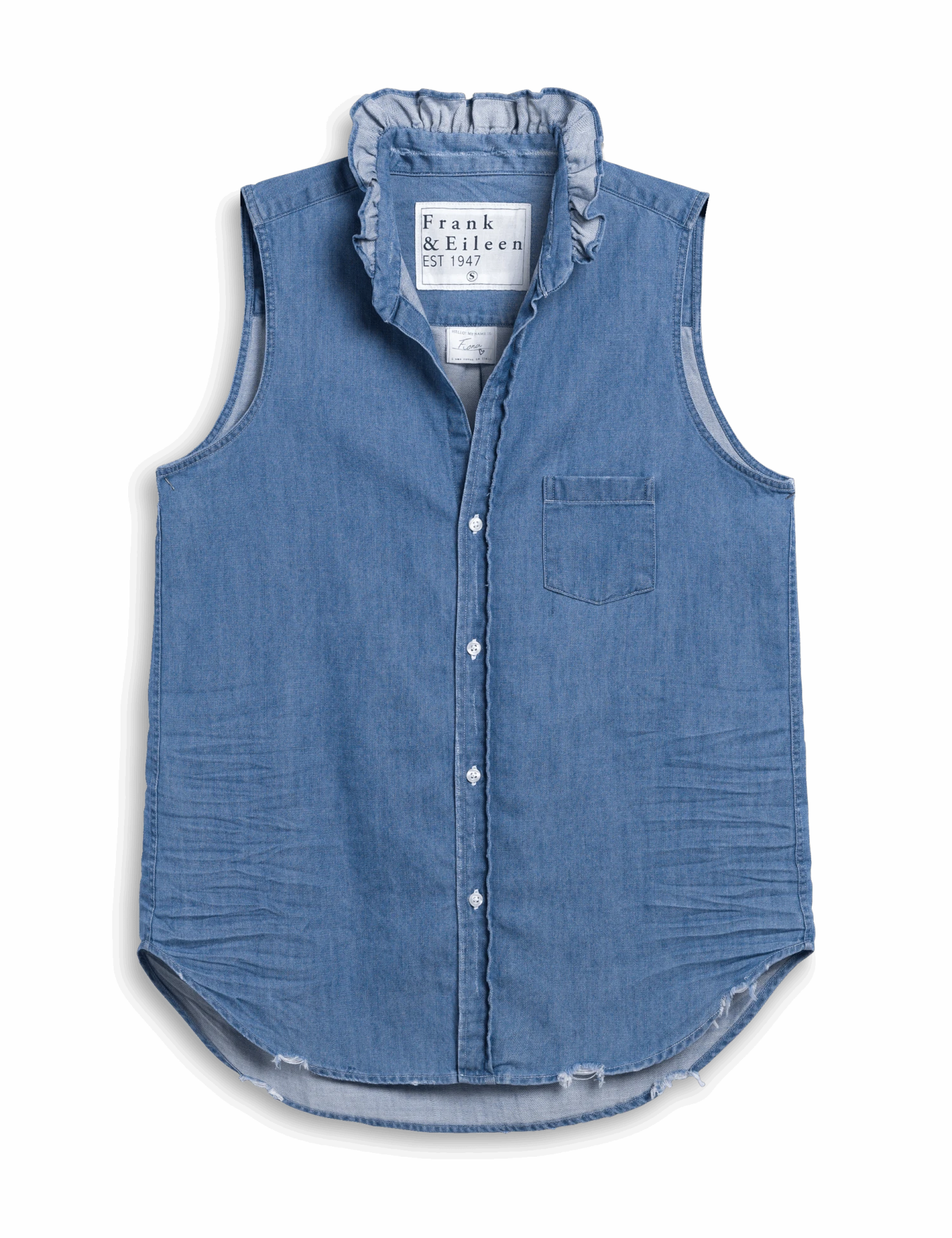 Just like the original, our sleeveless Fiona Ruffle hits the sweet spot between easy-breezy and pulled-together, with the sweetest ruffle collar for an added feminine touch. This button-up is perfect for warmer weather, while the ruffle detail and longer hem look beautiful peeping out from sweaters and cardigans on cooler evenings.