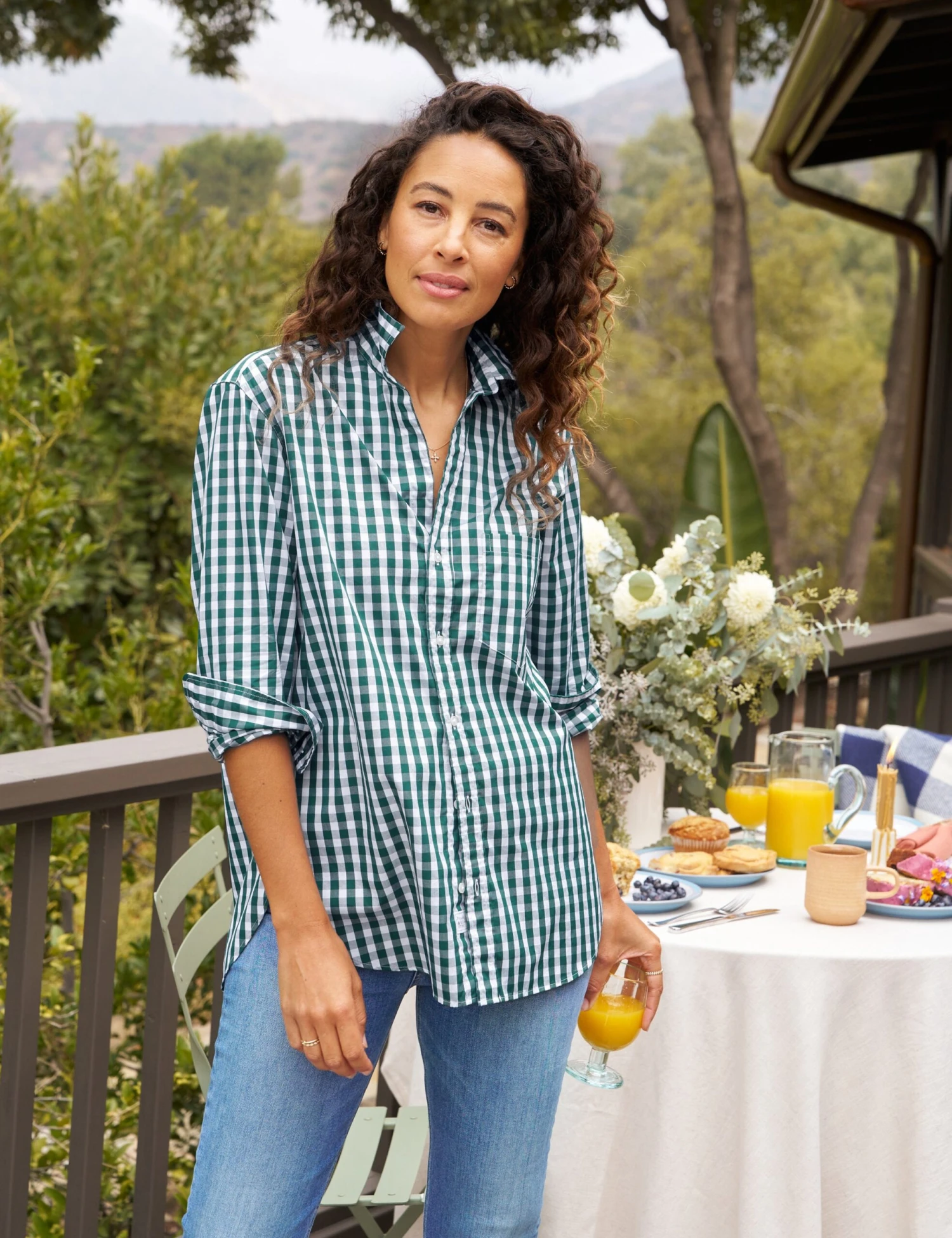 Our menswear-inspired Joedy is intentionally oversized, with extra coverage in the back. A prominent pocket, flattering center-back pleat, and longer hemline make this button-up the perfect length to layer over leggings or jeans.
