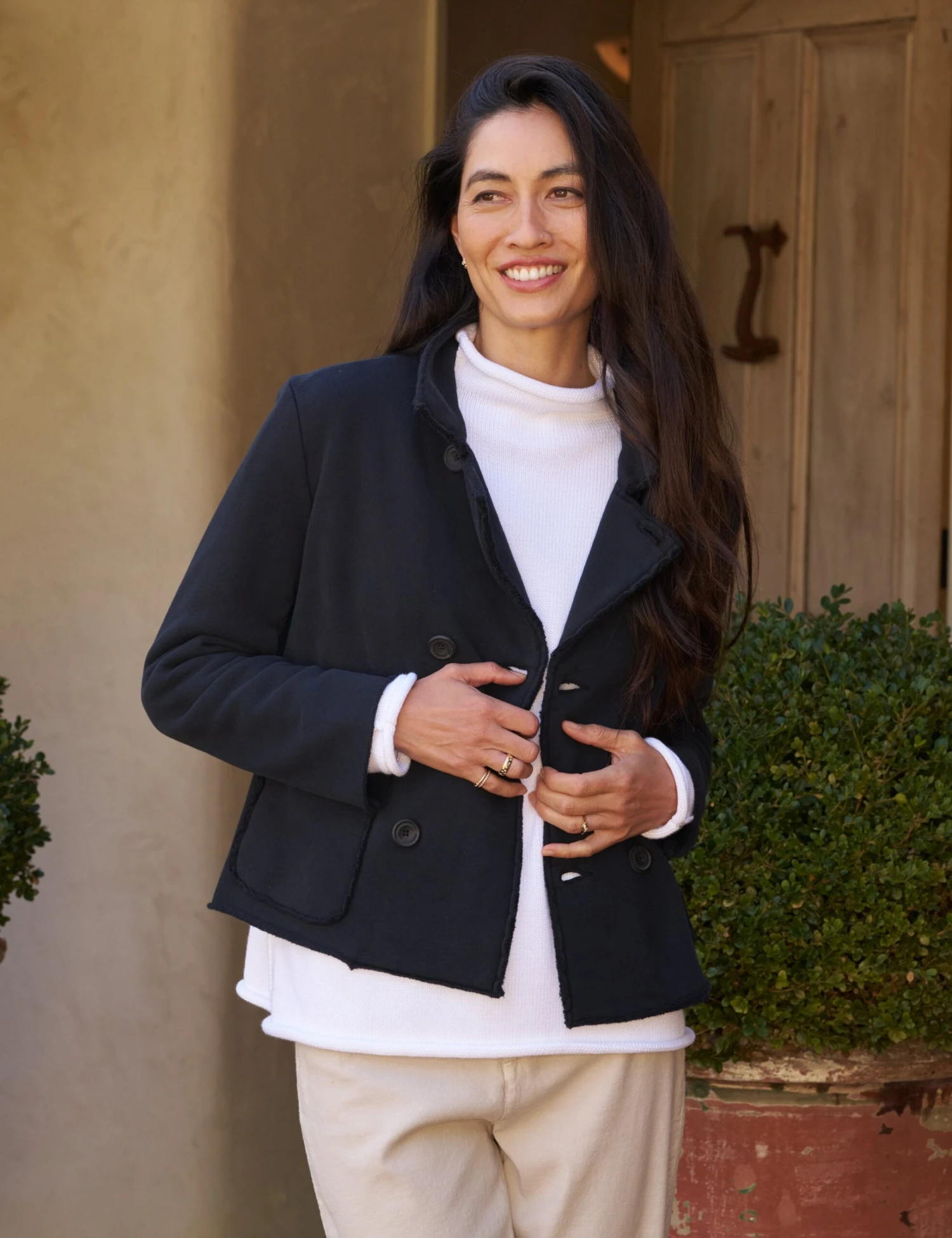 Our Belfast English Peacoat was love at first sight! This mini, everyday version has all the best parts of the original—luxurious horn buttons, scrunchable sleeves, and a statement collar — with the cutest cropped fit!